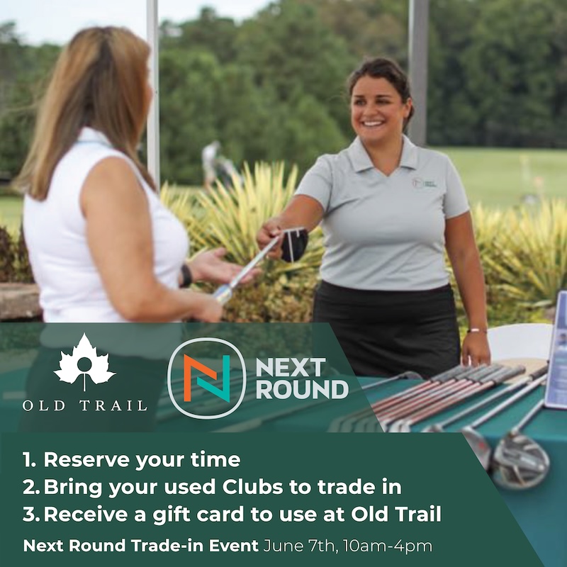 Trade-in your golf clubs to get a credit for Old Trail! Use it for rounds, in the Pro Shop, in Restoration - anything at Old Trail. Next Round is offering credit for men's, women's, and kid's clubs, as well as bags in good condition.